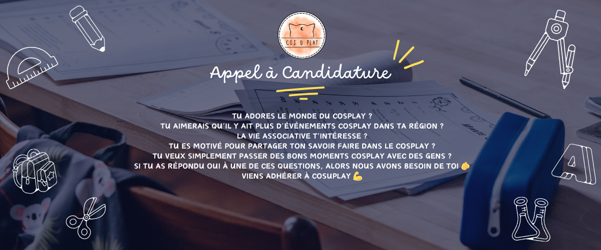 Nous sommes une association basé sur Orléans et ayant pour but de partager la passion du cosplay. Mais qu’est-ce que le Cosplay ? Le Cosplay, fusion des mots “costume” et “play”, est un loisir qui consiste à jouer le rôle d'un personnage de fiction en imitant son costume, ses cheveux et son maquillage. On appelle les pratiquants des cosplayers (cosplayeur, cosplayeuse en français). Cette discipline sollicite bon nombre de domaines différents comme : la couture, la coiffure, le maquillage, le bricolage, la photographie, le théâtre, etc...